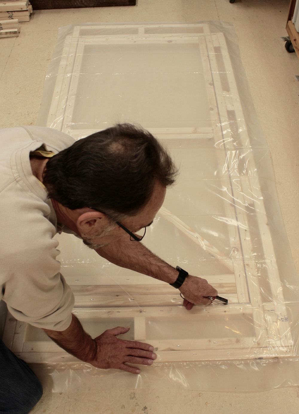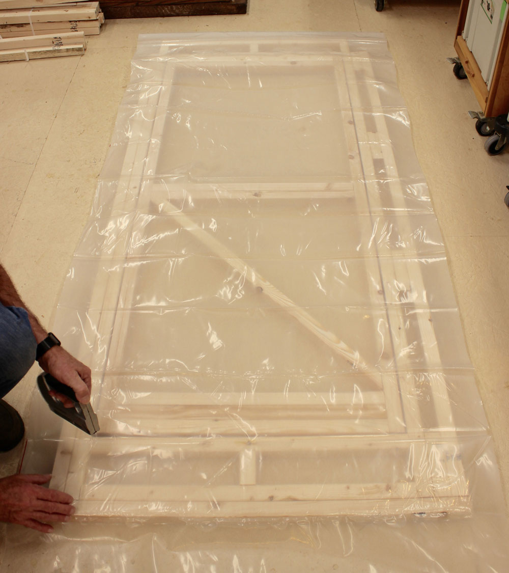 Unfold the plastic and place it over the entire assembly. Center the plastic so there is about 3-inches of overhang on both sides. Use staples to attach the plastic to the doorframe, the door, everywhere… use plenty of staples, this is no place to be stingy.