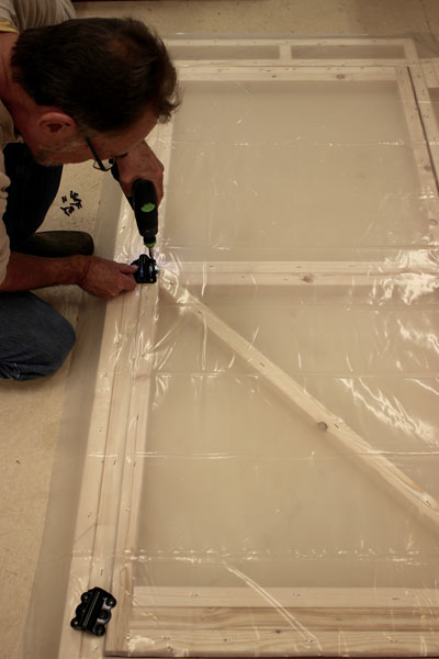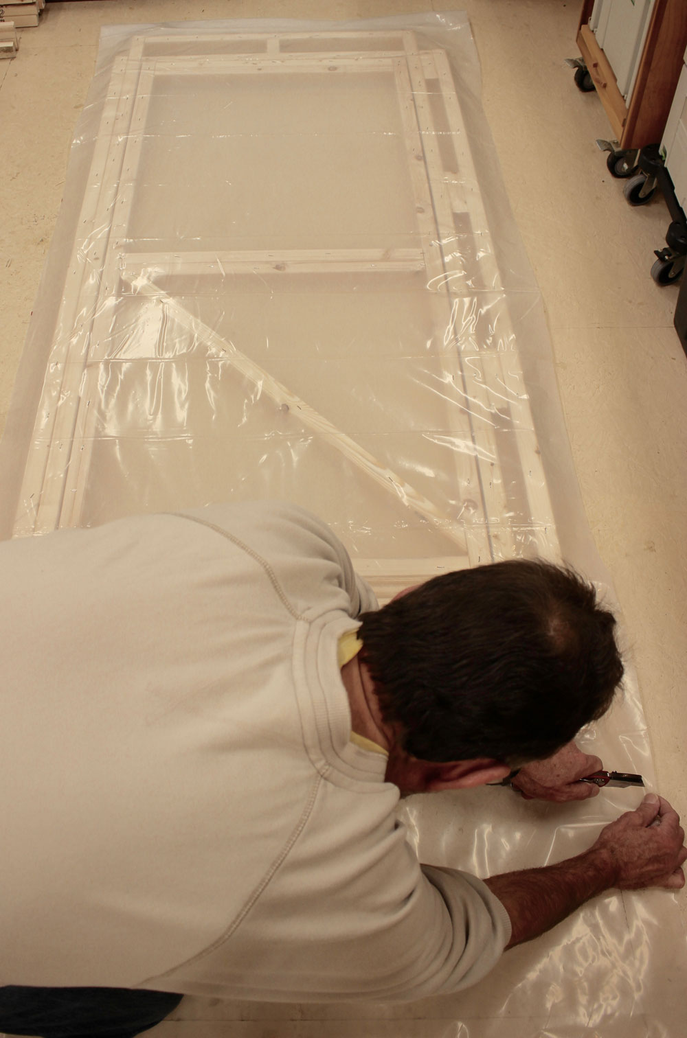 After the plastic is attached, trim off the excess top and bottom leaving the same 3-inches of overhang. Now (and only now), temporarily place the hinges approximately where they will be mounted, and then cut the plastic on the other three door sides. The plastic running between the doorframe and the door on the hinge side does not get cut!