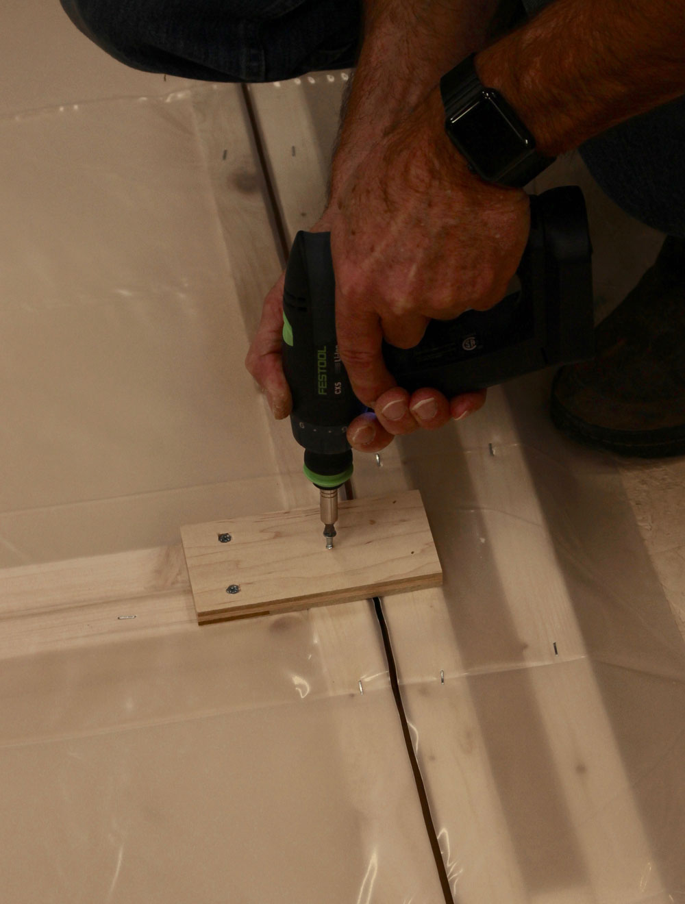 Put something thin and soft on the floor… I like to use that non-slip stuff that goes under throw rugs… and place the doorframe and door assembly into the opening. Tighten the elevator bolts against the wall or opening and ceiling. The 3" overlap left on the plastic can be taped to the walls with painter's tape for a true seal, or they can just be left lying against the wall… the 6 mil plastic is thick enough that it will stay against the wall by itself.