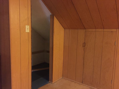 The bath vanity is a homemade affair, painted plywood with a laminate-covered top. Particularly endearing is the strip of laminate glued to the wallpaper on one side and posing as a backsplash. There is no external vent in the bath, powered or passive. Years of high humidity have had a pronounced impact on walls and ceiling. The wallpaper on two of the walls was probably cute 50 years ago, but today is hideous. There are two light switches, and until I open the walls I have no idea what they control… or were supposed to control… right now they seem to do nothing. The bathroom is not a pure rectangle… there is a section of one corner that is obscured by an angled wall. At first I thought it might have been a chase for plumbing and electrical, but it is not… there is nothing inside… just wasted space.