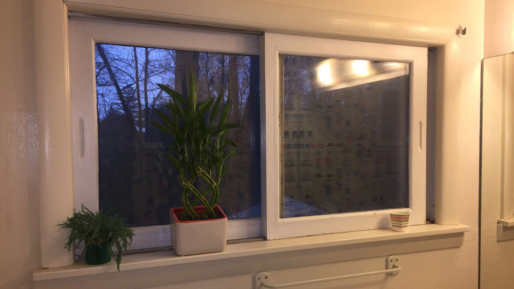 The single electrical outlet by the sink is not GFI (how that got past the inspector when I was buying the house I will never know). There is a sliding window that is stuck open about one inch. It appears to be a homemade window and has non-insulated glass. As a temporary stopgap measure, I made and installed a screen a couple of years ago to keep the bugs out. In the winter I stuffed towels in the opening to keep out the frigid air.