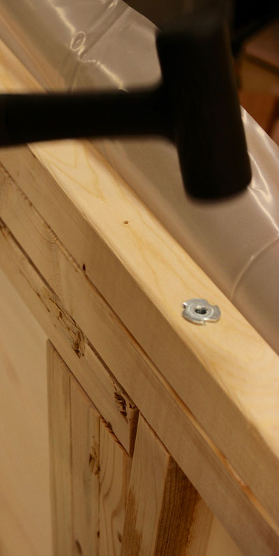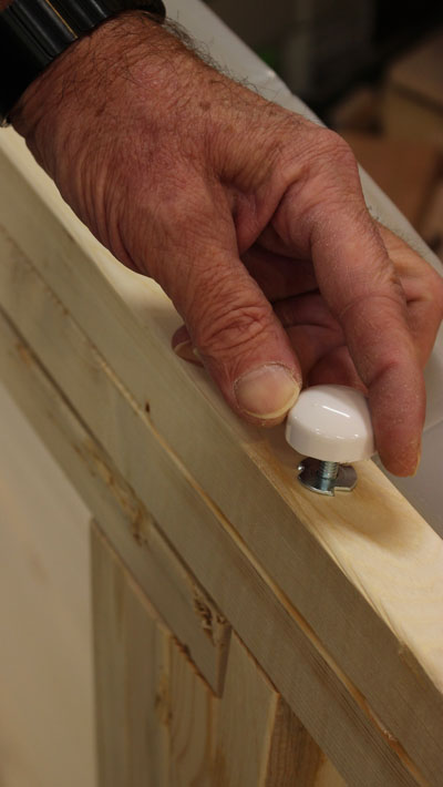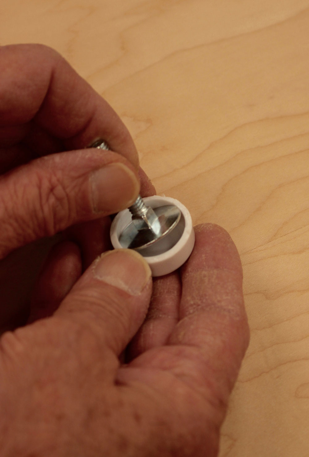 Perhaps while taking a well-deserved coffee break, take a few minutes and cut off the bottom one-half inch or so of six of the chair tips. An easy way to do it is to slip the chair tip over a dowel and use a sharp knife. Slip the shortened chair tips over the elevator bolts to form the basis of the mounting and wall tension adjustment system. To install these in the door, locate and drill 5/16" holes in both sides of the doorframe and in the top. Pound in the threaded pronged inserts. Thread the elevator bolts with the cut-off chair tips into the threaded inserts and the temporary access door is complete and ready to install.