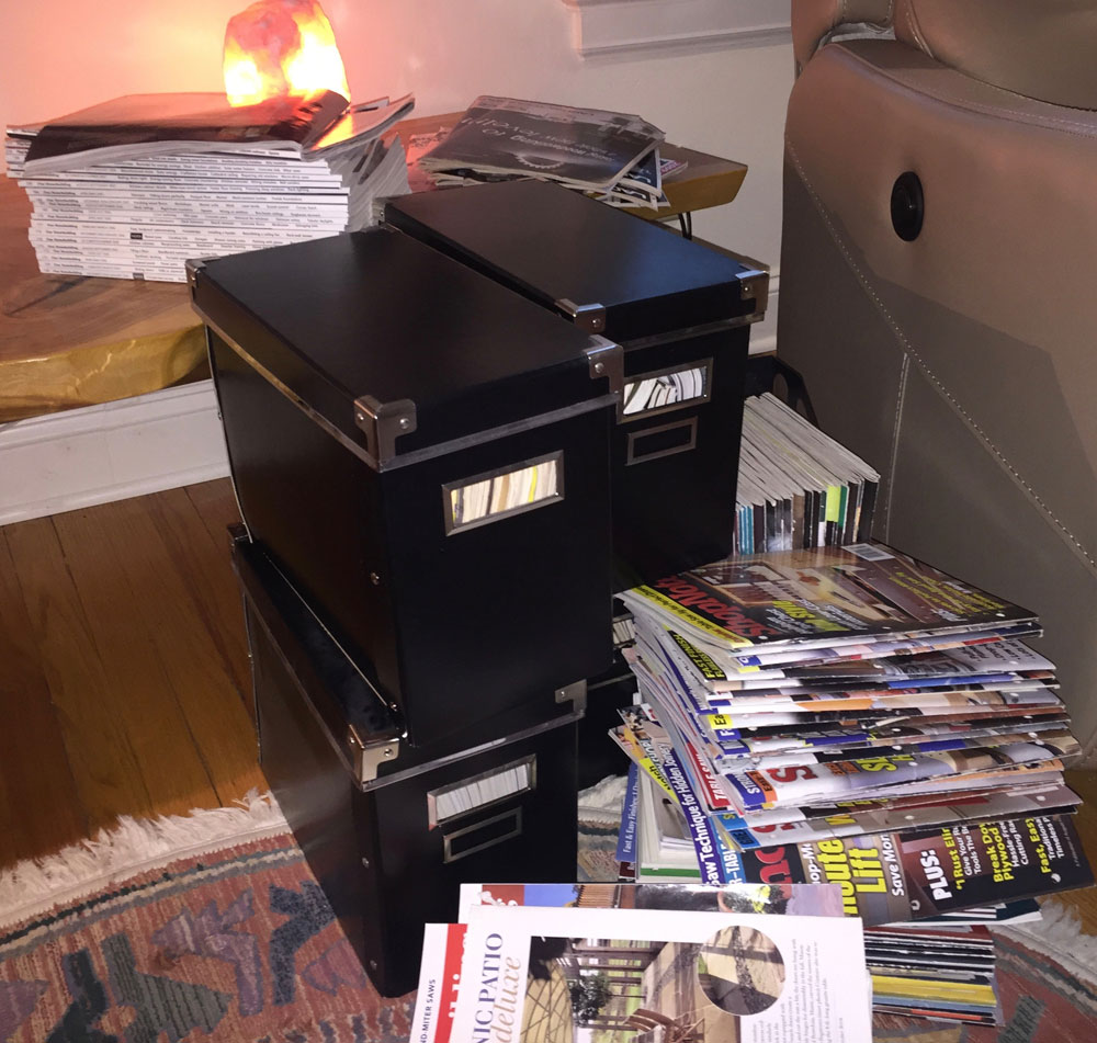 At that point, clearing out the room got decidedly more difficult. A four-foot wide, six foot tall shelving unit was completely filled with well-organized stacks of woodworking magazines going back to 2002… the last time I cleared out my woodworking magazine collection. After much hand wringing and anguish over the thought of throwing away my precious magazine collection (again!), I decided to take a more pragmatic and compromising approach. I moved all the magazines downstairs within proximity of my easy chair. For weeks, instead of watching television or reading, I paged through the magazines, one by one.