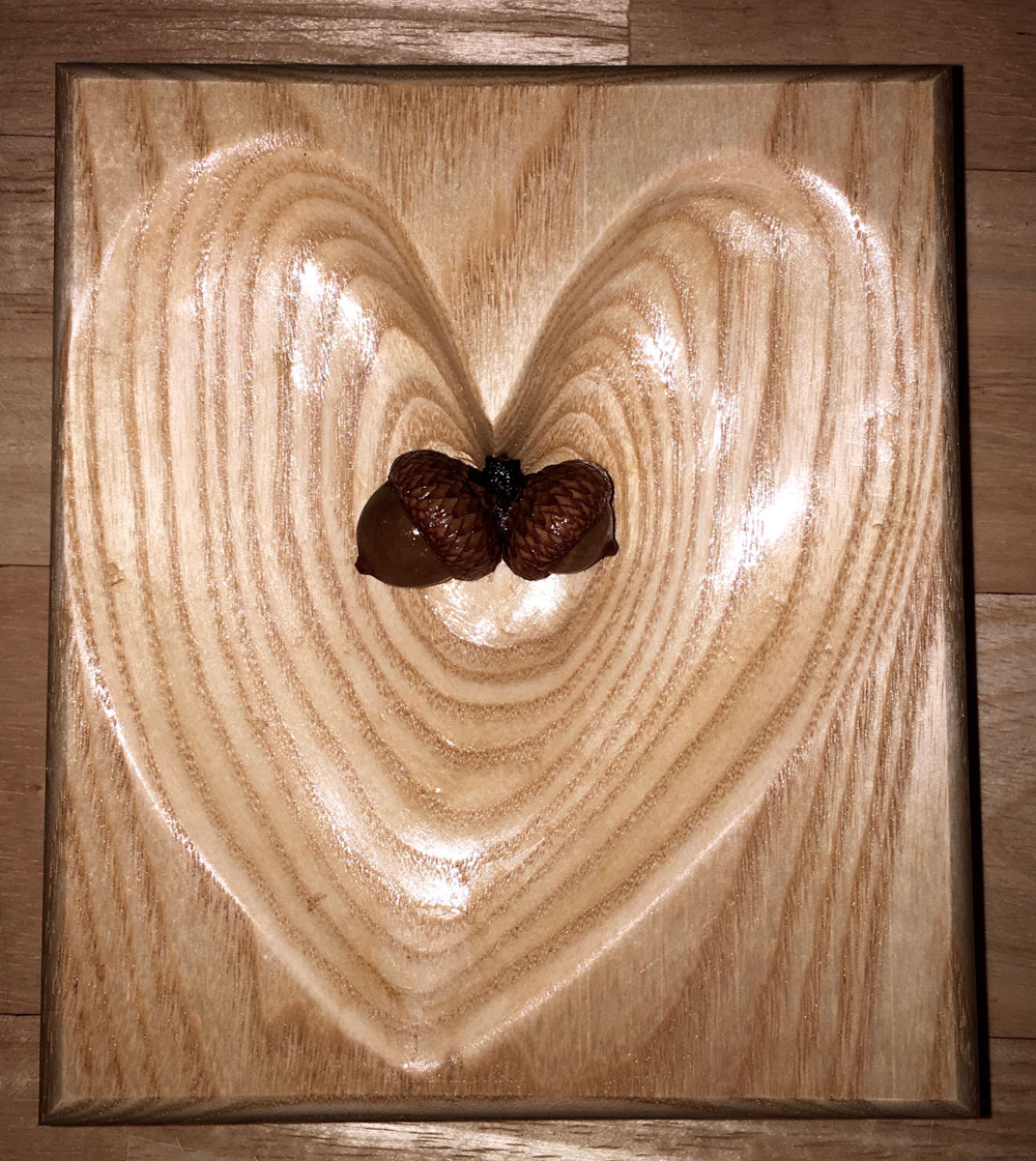 I had an idea of carving a heart in a piece of wood and mounting the acorns inside. It would make a cute gift, however the problem was pretty obvious… I can't/don't carve; no talent, no experience… remember?