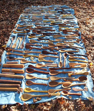 Below is a set of spoons that are all walnut and it was my attempt to make a set of spoons that look like they were carved years apart. The wood came from an old timber frame barn erected in approximately 1860. The walnut beam was 10 inches wide in places and I saved a few pieces of it that were good from the firewood pile. Then I made about 20 pieces out of it. The walnut could be 200 to 250 years old. The grain is very fine and you can feel the difference.