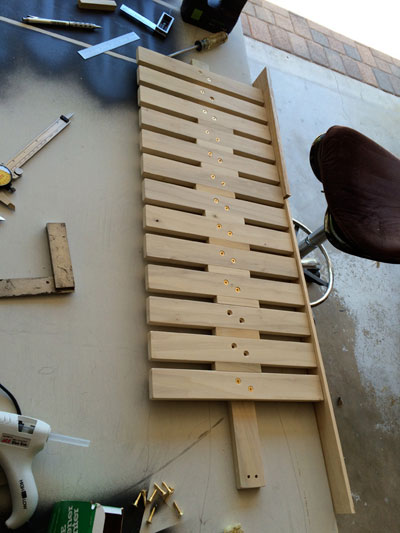 Each cross member is attached to the spine with two #8 screws. I put spacer