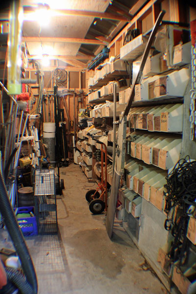 The picture below shows the adjoining room to my shop, which contains storage of materials. I used to have multiple small tools like box cutters, rasps, chisels and the like. I got tired of them being scattered all over and not having enough wall space to hang them up. I always had one somewhere. Everything is in a box of like things but now when I want something there are too many boxes to choose from. I salvaged the plastic file boxes when a company scanned in all their documents and threw them out. I enclosed the end and the entire rack to the right is all fasteners, nails, screws, bolts, washers, etc. Beyond is all outboard motor and boat parts, beyond that is misc door knobs, sewing spools, hospital drip bag hooks, etc. I take anything, I only turn down my collar.