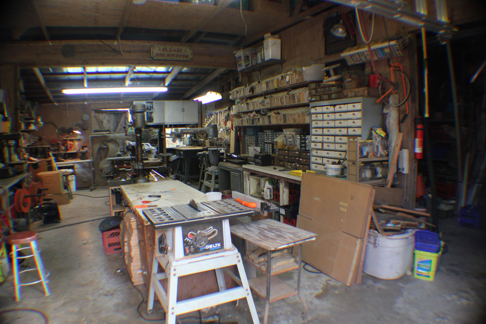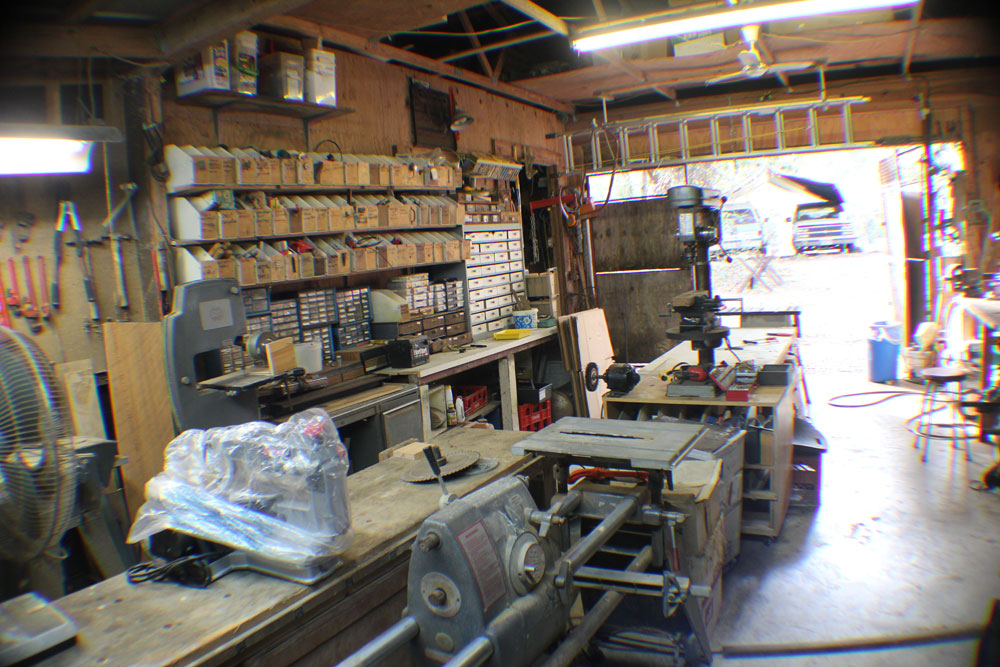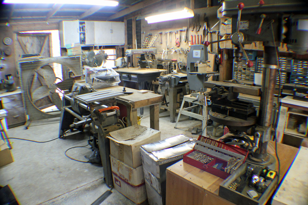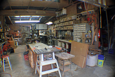 Below is a view from the back of the shop, looking forward. My drill press is in the middle, the left side are boxes and drawers with fasteners, parts, and tools, with a small metal brake. There is a 230 amp welder in the right corner.