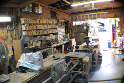 My shop is basically made up of three areas. The main work room, the large storage room and reloading bench on the right and a wood storage rack in the back.
