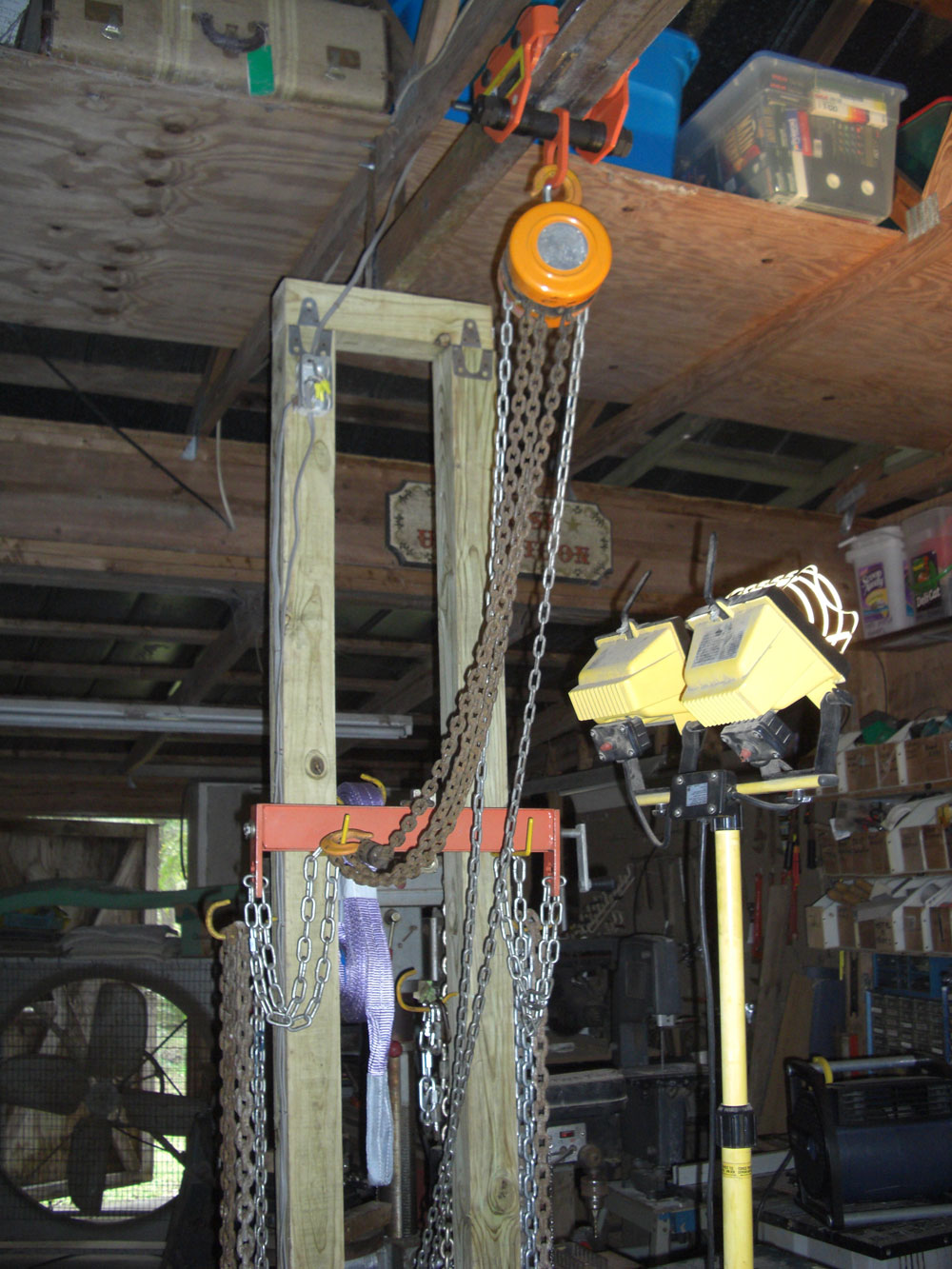 The last cool part of my shop is my newly installed overhead chain hoist on a track with two trolleys. I can now easily remove large outboards or entire boats from trailers and drag them into the shop.