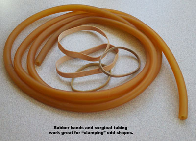 Surgical tubing is rubber (perhaps plastic) tubing available from medical supply companies - such as CVS Pharmacy - that is very useful for clamping larger items such as when gluing chair legs or larger projects. You simply wrap it around the project and then tie it in a knot.