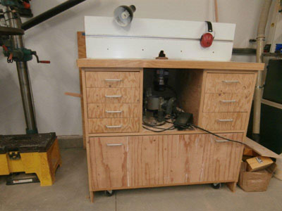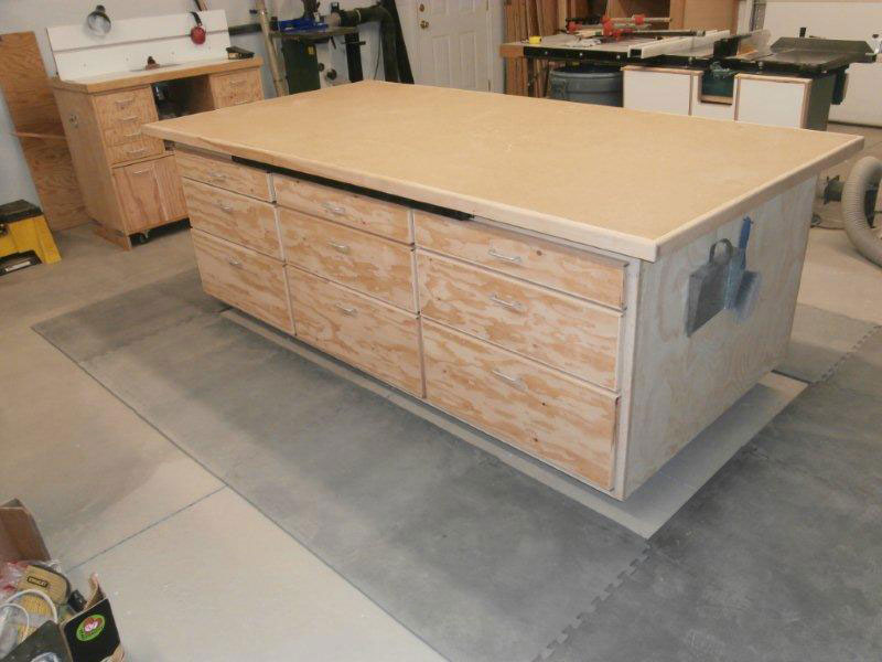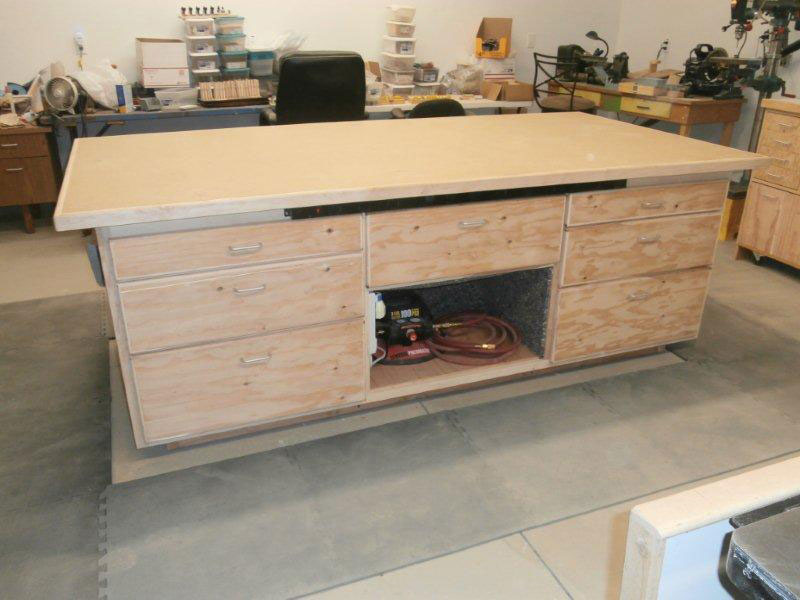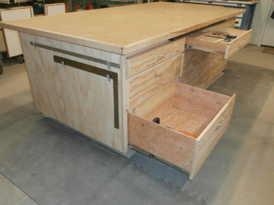 My central assembly table has three bays (on each side) and drawers for storing my hand tools and small power tools. There is also a small air compressor for my air powered tools. It is sized and located to double as an out-feed table when ripping long stock.