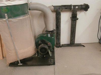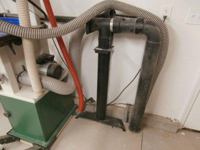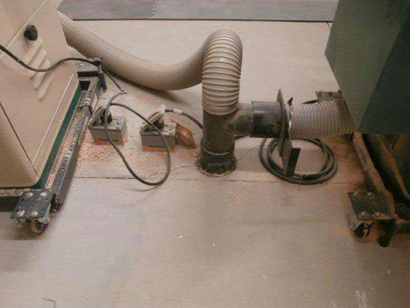 I used 4" ABS to connect one side to the other under the slab with a Tee in the middle for the table saw and jointer.