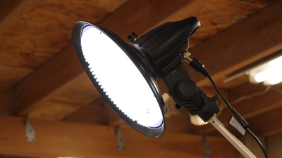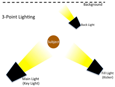 Lighting need not be expensive. The spring-clamp metal-reflector work lights from the big box store are cheap and work pretty well to start out. A well-worn but standard and infinitely valid technique is called 3-point lighting. A main light, called the "key" light, on the subject, a second "fill" light, or "kicker," from another direction (usually a slightly weaker intensity and set to fill in the shadows made by the "key" light), and a third light on the background or toward the subject from behind (the "back" light) is the basic set-up and is appropriate for lighting people or objects. Typically the main light will be the brightest, the kicker will be the second brightest, and the third background or highlight light will be the third brightest. It can be as simple as putting a 100 watt-equivalent bulb in the main light, a 60 watt bulb in the fill light, and a 40 watt bulb in the background light.