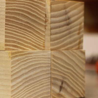 After the leg stock glue-ups were fully dry, I jointed and planed the blanks until they were perfectly square. One end of each leg blank was trimmed square, then the other end was cut to bring the leg blanks to their finished length. It turns out that for each leg blank I cut off about an inch-and-a-half. So I wound up with 9 little squares each made up of 4 pieces of wood. I didn't think much about those scraps, but they did have very interesting grain patterns when viewed from the end.