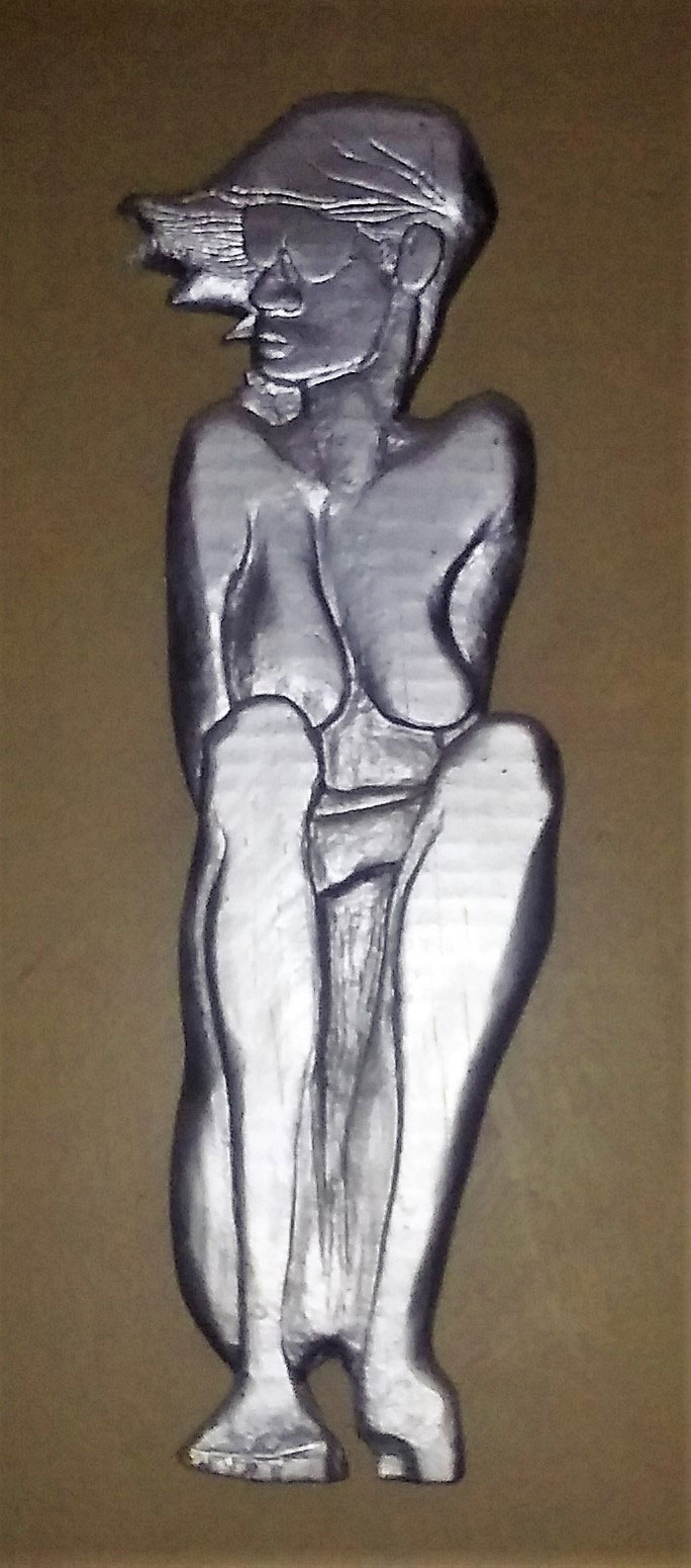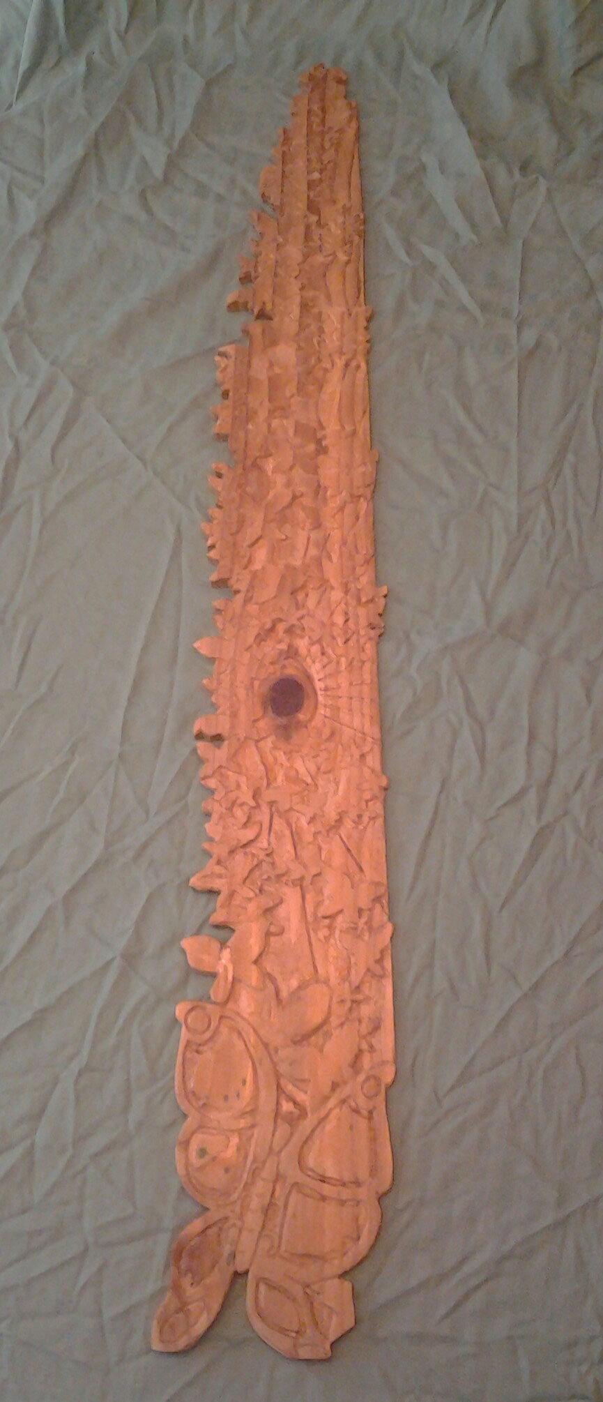 , a piece of wood my Dad gave me many years ago. I rarely used chisels, except for wholesale removal of large sections of wood. The remainder of the work was done with carving knives, or, more precisely, Exacto tools. This is time consuming, of course, but allows much more dexterity with woods like cypress and cedar. The cypress had been in a pond for some time, and had become punky in several places. The cedar is a piece of siding off my Mother-in-laws house. The grain was very pronounced, and heavier tools would have caused splitting. Hand held tools, in my opinion, create a warmer, more approachable piece. The occasional cut allows an intimate connection to the carving, a blood oath, of sorts. Power tools move so quickly, a variance in the grain may be overlooked en route to the final outcome. With a delicate blade plying the wood, the artist must pause at an unruly knot or shift in grain. This pause gives the wood a voice in the process. It may maintain a piece of its character. This may seem overly romantic, but I have always sought out the image in the wood rather than determining a goal and separating the wood in the way.