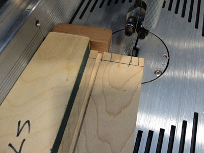 After cutting the pieces to length it was time for dovetailing. The tails were cut using a 1-to-8 fixture riding on the fence of my bandsaw.