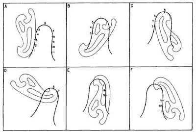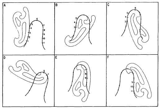 Now that we have cleared up what a french curve is, how does it work? If you have a sequence of points that you want to draw a smooth line through, you can use a french curve to draw a series of line segments that will flow through all of the points. As shown in the diagram below, you can select a section of the french curve that best fits the first three points and another segment that fits the next part of the curve. You walk your way along the curve in this manner. You are connecting the curve of one segment into the tangent of the next segment to provide a continuous smooth curve among all the points.