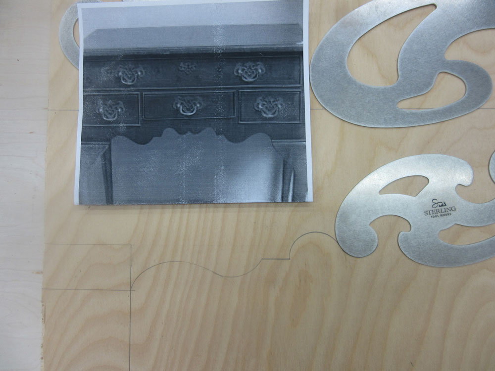 The large size of Sterling's Roubo Curves lets you draw these smooth curves on full size drawings as well as directly onto your wood pieces. For example, if you were drawing the curves along the lower rail of a low boy, you could draw them in full size with these templates. The following picture shows an example of using Sterling's Roubo Curves to transfer the shapes from this low boy to a board. You can mark the transition points and then use the various segments of the curves to draw a smooth curve as described earlier.