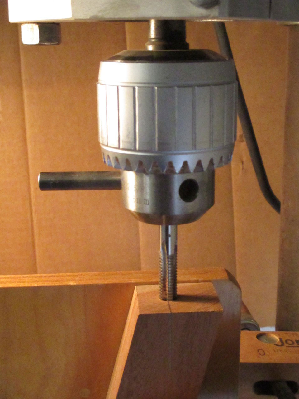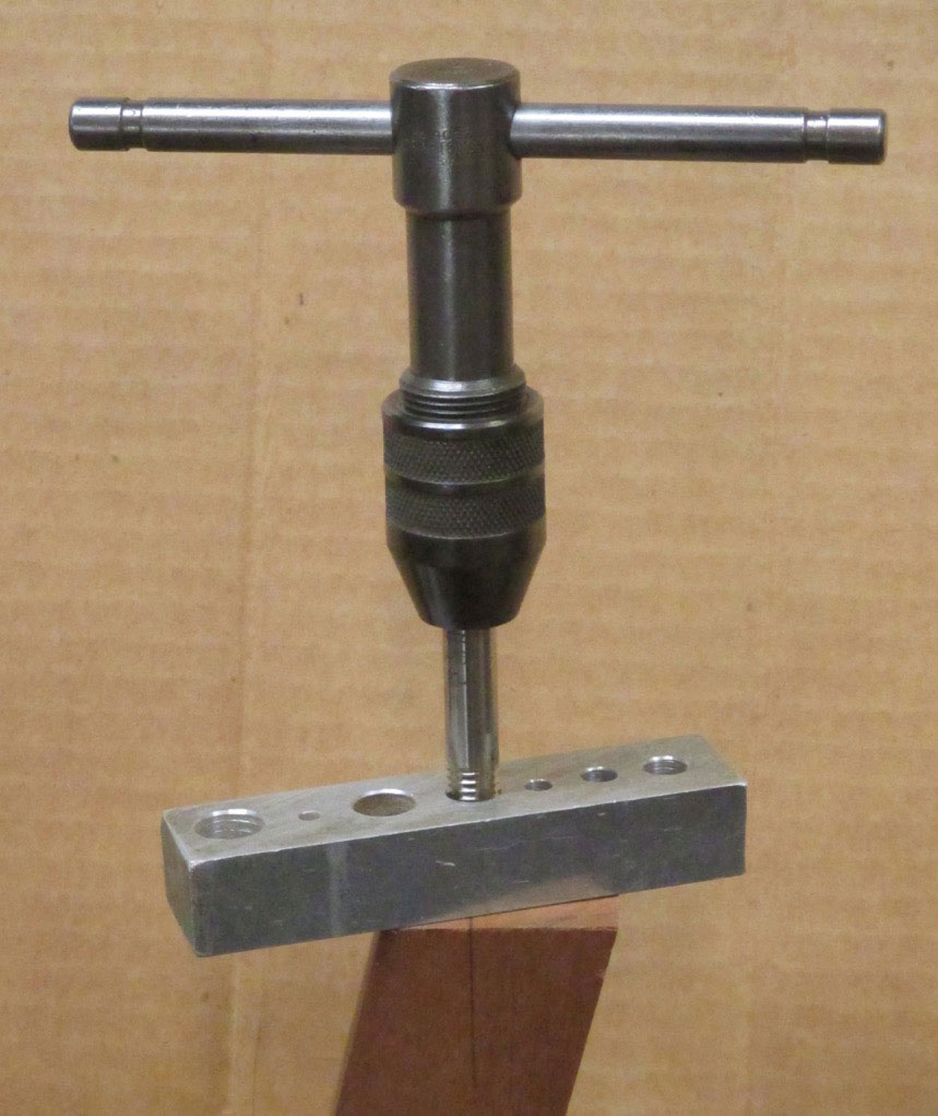 While I still had my work-piece clamped in place for drilling I left it in place so that I could tap it using the same setup. I replaced the
