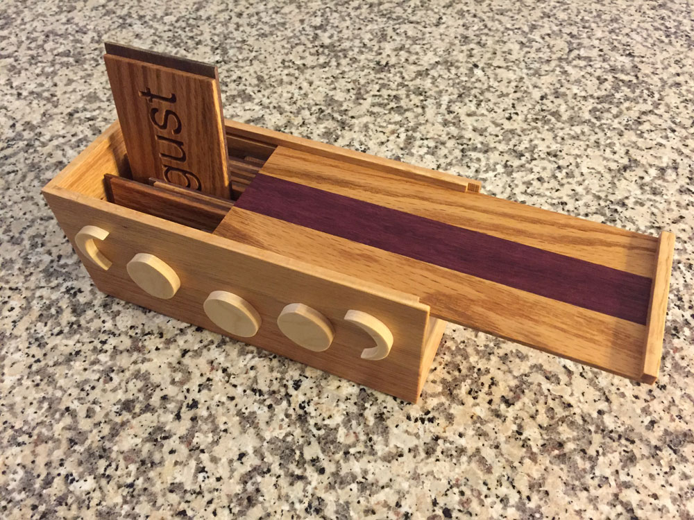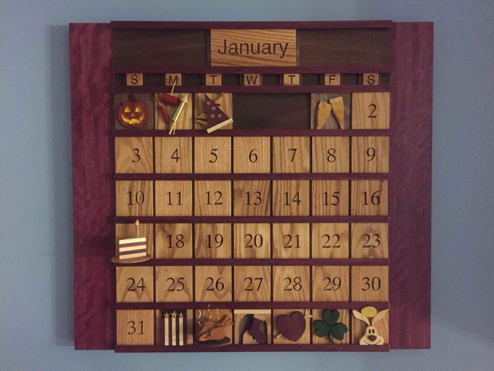This past summer, my wife asked me to design and build a perpetual calendar for above our kitchen sink. I just completed it, along with a box to store the extra months.