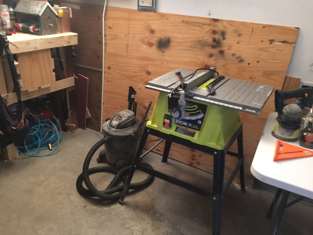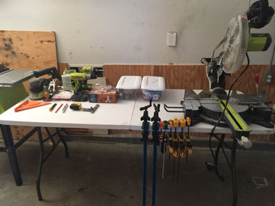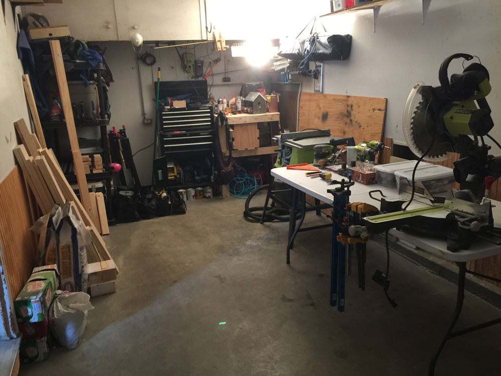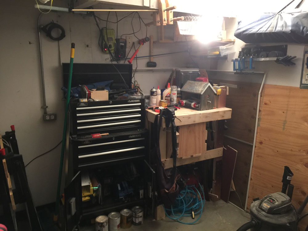 When the garage isn't being used for my Mom's car, I use it for my shop. In my shop I have my tool chest and a bench I made from pallets. In my tool chest I have all my screw drivers on top and my power tools on the bottom.