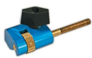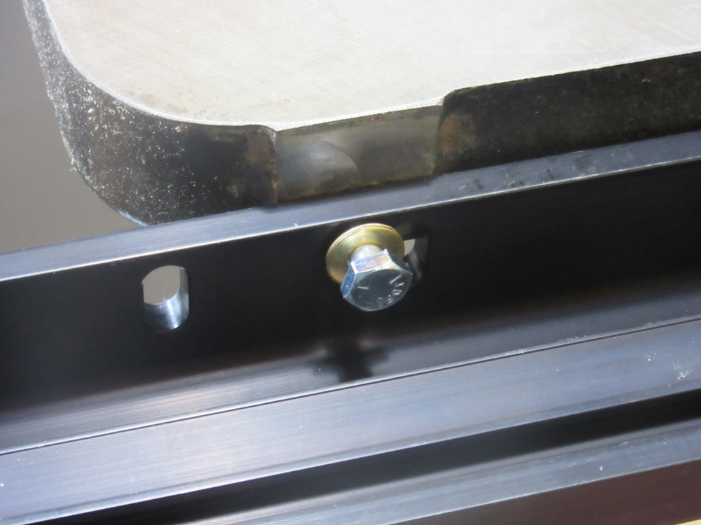 The next part of the installation involves putting the magnifying cursor in place and the bracket for the fence itself. The following photograph shows the cursor in place and the four (4) nylon leveling screws partially installed. The four leveling screws provide vertical adjustment for the fence and allow the fence to slide easily along the front mounting rail. The two bolts (one shown in the picture) will be used to adjust the fence for drift.