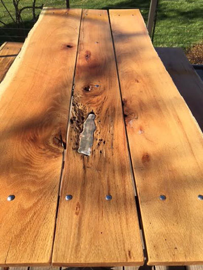 Our 24 year-old picnic table was at the end of its useful life. I discarded the old boards, refurbished the legs and made my own boards from an oak tree that had been laying in the pond for a few years. Critters ate a hole in one of the boards, leaving a hole. I found a rock that pretty much fit the opening. Epifanes Clear Varnish is the finish.