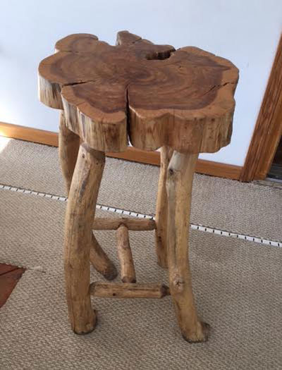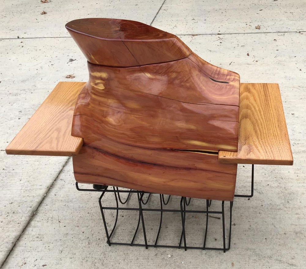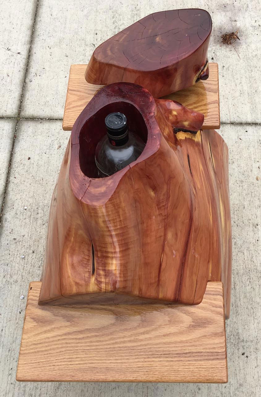 My wife and I were camping at Mississippi Palisades State Park in Illinois. Someone had rolled a red cedar stump up to our campsite fire pit. It hadn't been burned and I have no idea where they found it. It seemed a shame to burn it, so I rolled it into my trailer to take home and make something out of it. It sat outside all winter while my mind worked inside. There didn't seem to be many uses for a stump that I could come up with.