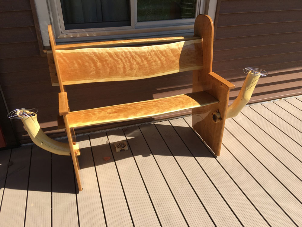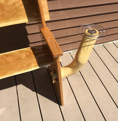 The beer holders on each side were made from limbs from an oak tree that fell down this winter. I left the sapwood on so it blended in with the cherry. I'm not sure where I got the stainless rings but I put them to use on top of the beer holders. They are held on by a tiny stainless piece I salvaged from an old grill. The two side pieces have three leveling screws each (salvaged from somewhere) to keep the bench from wobbling. The finish is a sprayed-on Epifanes clear marine spar varnish.