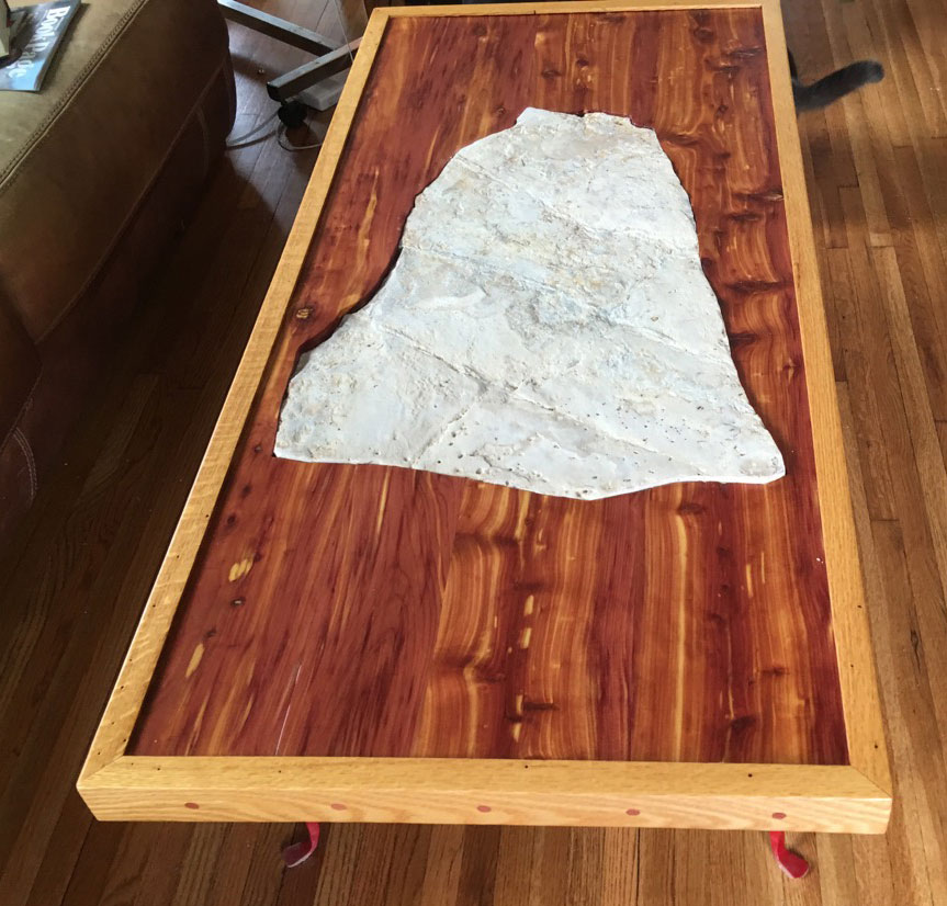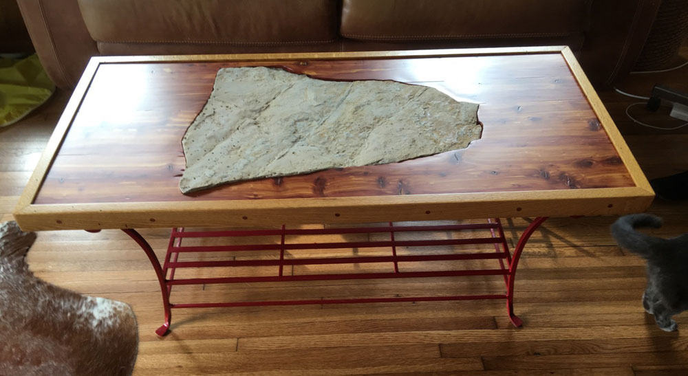 The top of the coffee table is red cedar trimmed with oak. I made the boards from trees that had to come down when I put in the lake behind the house. The base is from the old coffee table. This thing is NOT going to blow away...ever.