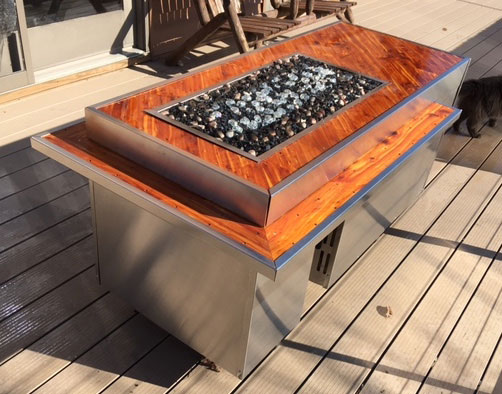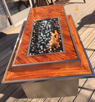 The top is made from a cedar tree I had to cut down a few years ago while clearing an area for a pond. I used a chain saw to cut it into slabs, then some hand planing and machine planing to make 3/4 inch boards. The finish is Epifanes Clear Varnish. There are 12 sprayed coats with sanding between each coat. The sides and edges are covered with stainless steel I had made for this project. The burner, pan, controls and fire rocks come from Moderustic.com. My wife made a custom cover for it out of Sunbrella Supreme with linen flock. It's a premium, waterproof exterior marine fabric. Overall, from planning to finish with a drink took two and a half years.