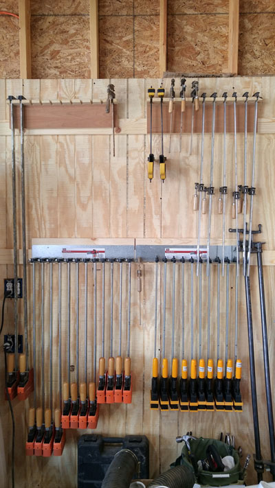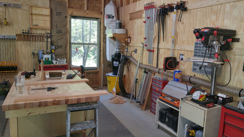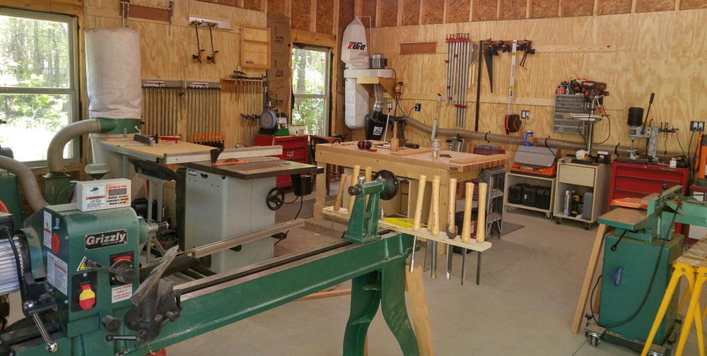 I have 2 dust collectors in the shop. One is only connected to my table saw and band saw. The other has a chip separator and primarily handles the jointer and planer, but I also have a floor sweep near the bench to pick up shavings from any hand tool work. I put all my clamps on racks near the bench so they are easily accessible and all of my marking, measuring, layout and hand tools are stored in the bench. I also have a sharpening station near my bench that includes a wet grinder and other sharpening stones. Just about everything in the shop is on wheels so that if I do not like where something is, I can move it. I can also wheel out certain tools, use them and then wheel them back.