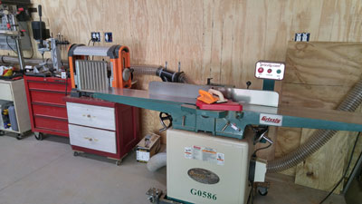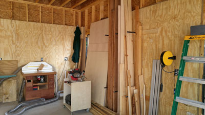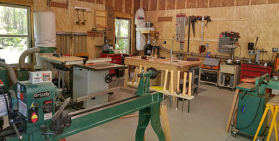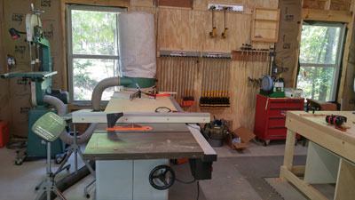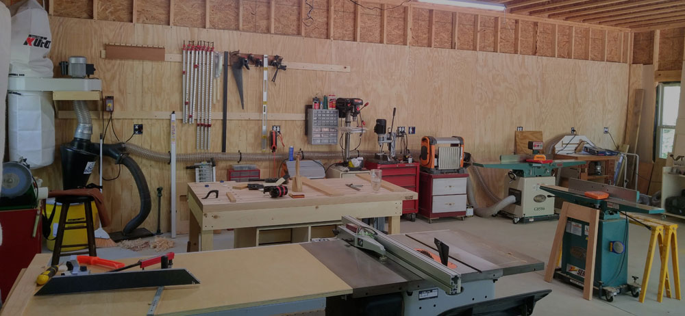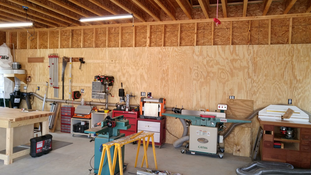 People ask me, "How did you get into woodworking" and I don't really know how it happened, it just kind of happened. You know, when you build that one thing and then someone says "I didn't know you were a woodworker" and you think "huh, neither did I, but now I'm a woodworker!" I've been woodworking now for about 15 years. I recently had the opportunity to build a dream shop, from the ground up. When I designed the shop, I wanted three basic things. First, I wanted it to be big enough, but not crazy big. So my shop is 32' wide by 24' deep, plenty big enough. Second, I wanted high ceilings so I could handle long pieces of wood without banging rafters or lights. So I built the ceilings to be 10' tall, which thus far has been perfect. Lastly, I wanted plenty of power and outlets. When I had the building put up, I had a separate power service run to the building, 100 percent dedicated to the shop. I also wired the shop to have outlets at cabinet height, so no bending over, and every outlet box is a quad box so I have plenty of 110V outlets all over. I also have some 220V equipment so I have those outlets all over as well. I also wired some power exhaust fans into the ceiling so if I am doing anything that is too dusty, or has many fumes, I can turn the fans on and vent the place out.