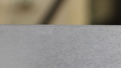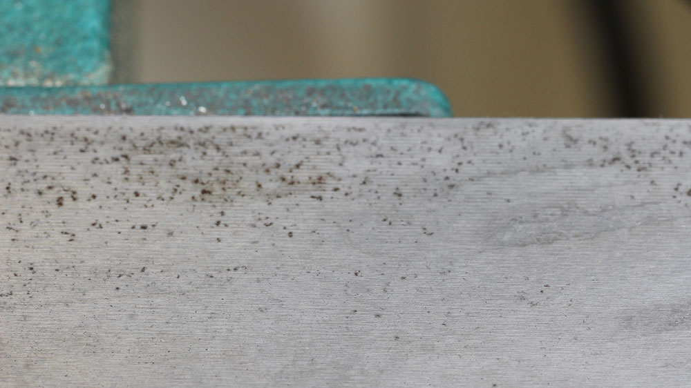 It's hard to describe how much mineral spirits to pour on. I would guess about a tablespoon for each square foot of surface area was what I used… not enough to soak the Vlies pad or damage the sander, but enough to thoroughly wet the surface. Under the action of the Festool sander, the mineral spirits quickly turned black resulting in a slurry of who–knows–what… probably oxidized metal, atmospheric dirt, and bits of the Vlies pad. A big roll of blue shop paper towels should be close at hand. Wipe up the black liquid before the mineral spirits can evaporate, then pour on a little fresh and have at it again. After the third or fourth time, the liquid was not turning black at the same precipitous rate, and the surface was looking really good. The rust spots were all gone, as was all the surface oxidation.