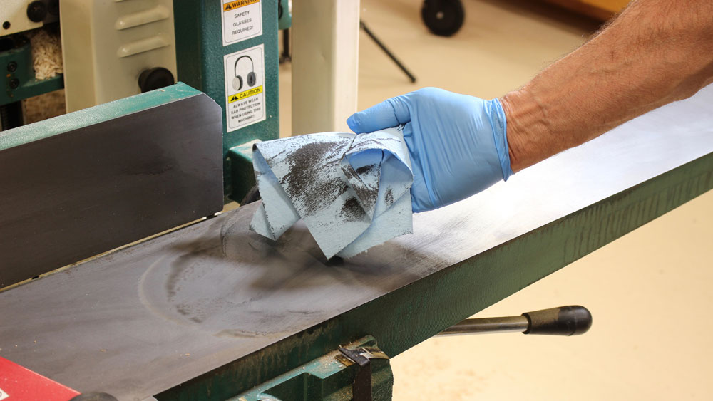 You will notice that in addition to looking much better, the surface is also now very slick. I was tempted to leave it like that, since a slick surface is so much easier when jointing big heavy boards. But don't let that temptation overcome common sense. With a clean surface, new rust will develop quickly if the humidity is high. As soon as I was sure I had removed all of the mineral spirits, I gave the jointer top a good spray of T–9 and wiped off the excess. Beautiful.