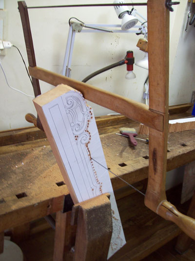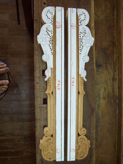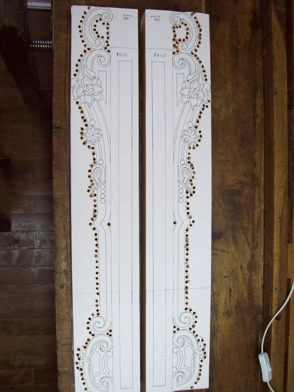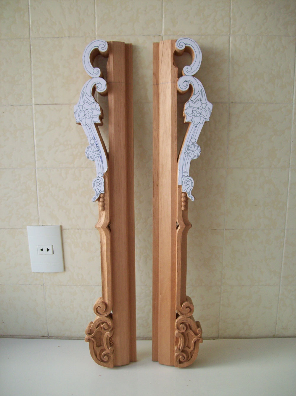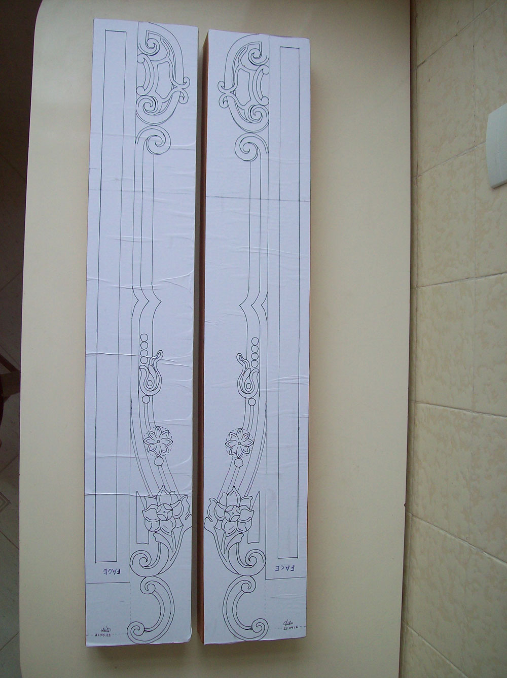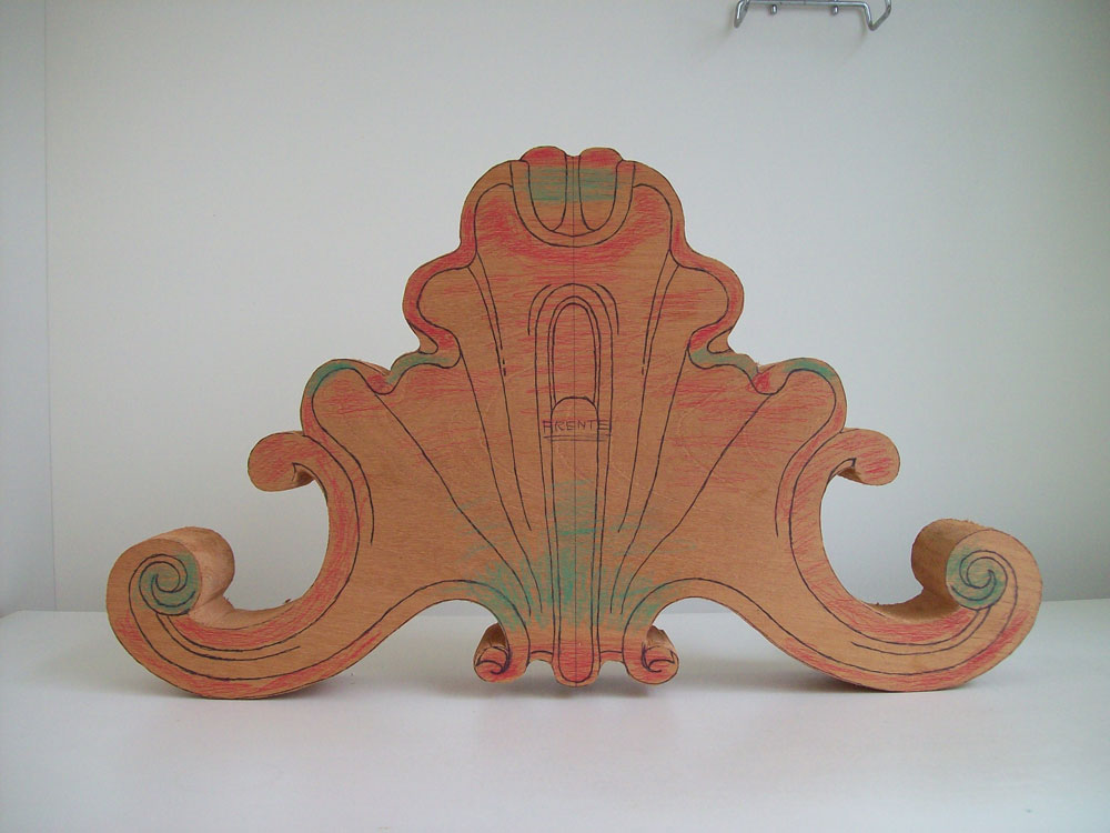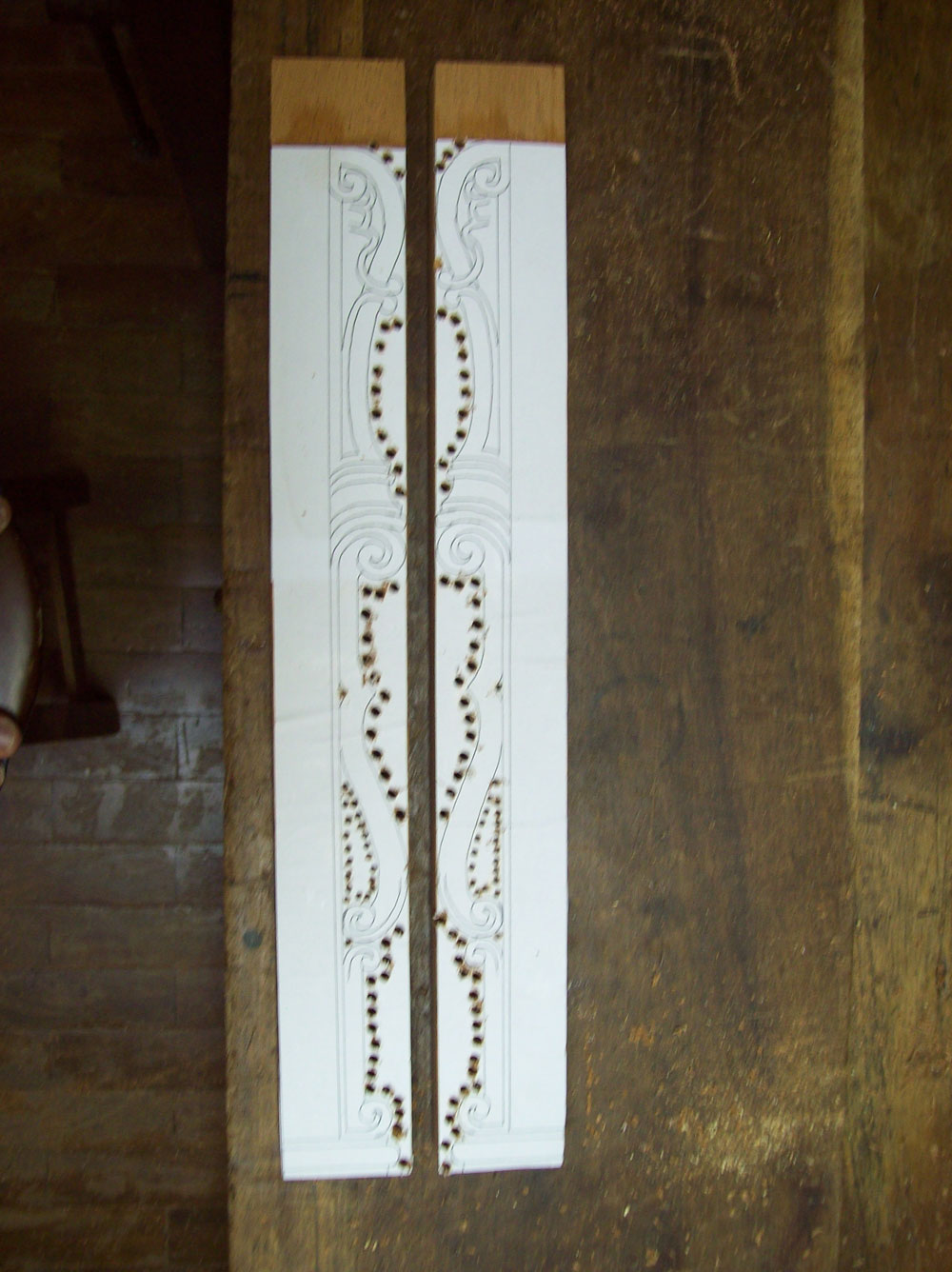 paper photocopy of a carving detail upon the board, instead of drawing it directly by hand, in