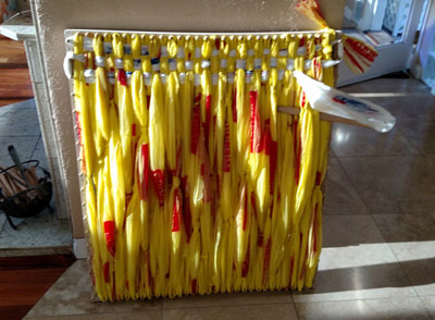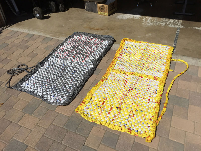 These folks are making "Mats" for our homeless military veterans to use as better protection for their sleeping bags and, as of late August 2016, have made about 150 Mats for distribution at an upcoming Stand Down. These Mats are being put together by folks from 8 years of age to 90 years of age. Below are two sample woven Mats:
