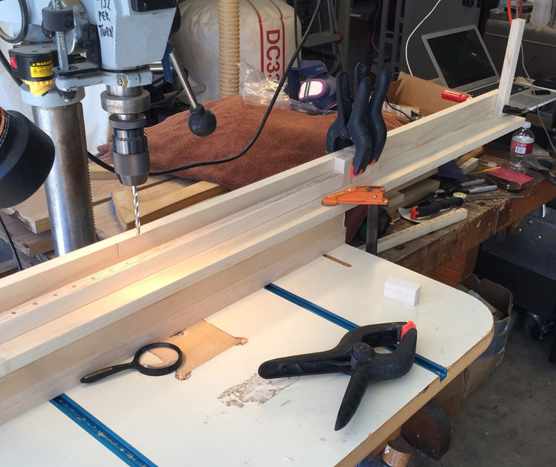 My drill press fence would not support a piece 40 inches long, so I jointed and flattened a piece of hardwood, ripped it into two pieces, and glued them together in a 90 degree L. That was mounted on my drill press with a 7/32 drill bit whose depth was set for a 9/16 inch deep hole in the rails and stiles. Because of the long length of the fence, I had to clamp the base table to the press metal plate to prevent any unwanted movement. And, yes, that did happen during practice drilling.