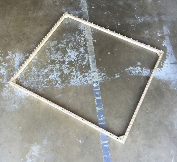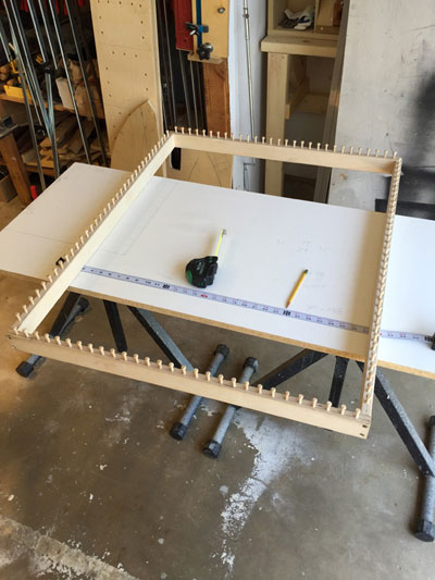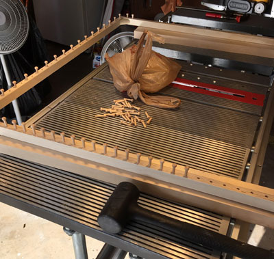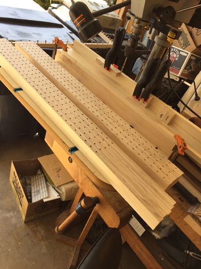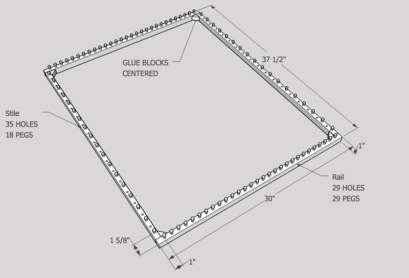 For the Stiles she requested pegs in every hole for her Mats, but we decided to drill all 35 holes in case other uses for the looms came about. All 29 pegs were to be installed in the rails.
