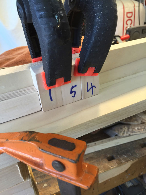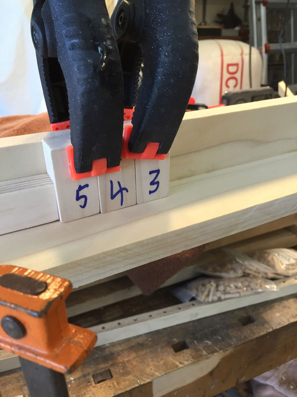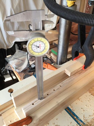 In order to meet the length requirements, each drilled hole had to be separated by as close to 1 inch as possible. Rather than try to mark up to 35 drill positions on a fence or – heaven forbid! – on each strip I decided to use spacer blocks.