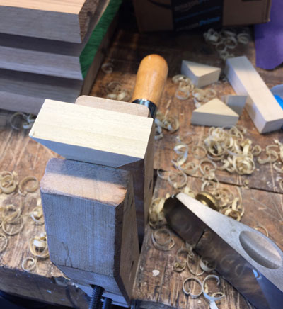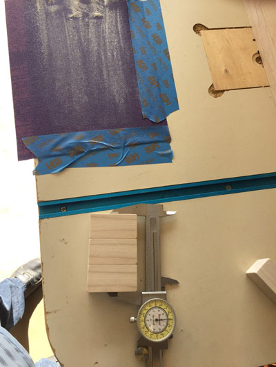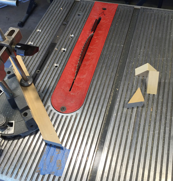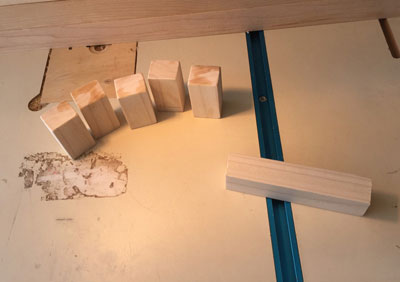 I used an available scrap of hardwood that was an appropriate thickness, set my miter gauge at 45 degrees using Richard Pattee's Miter Set, and cut several blocks. The blue tape gave me a starting point to assure a consistent size very quickly.
