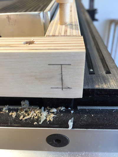 To locate the next hole, I released the right-hand clamp, added another spacer block in front, and moved the released clamp to hold down the new spacer block and the one next to it.