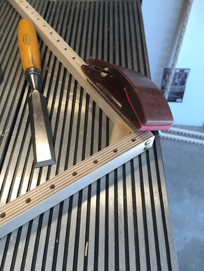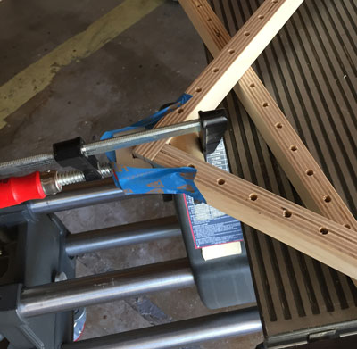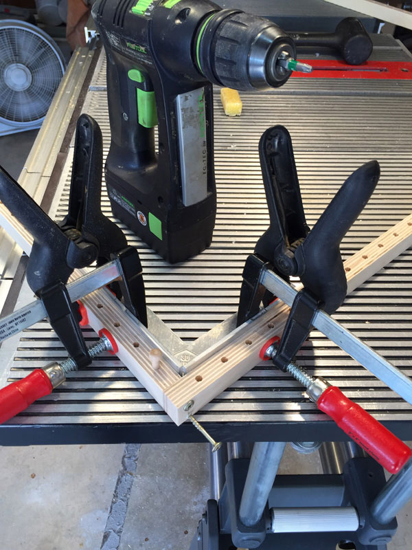 The rail/stile junctions were flushed and held to 90 degree with clamps. The two holes were drilled with a 7/64th bit to minimize the chance of plies coming apart when the screw was added. Each screw is a no. 8 x 1-1/2 Washer-head