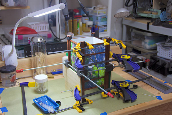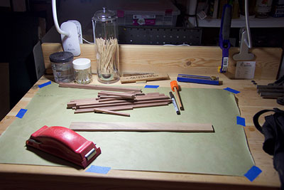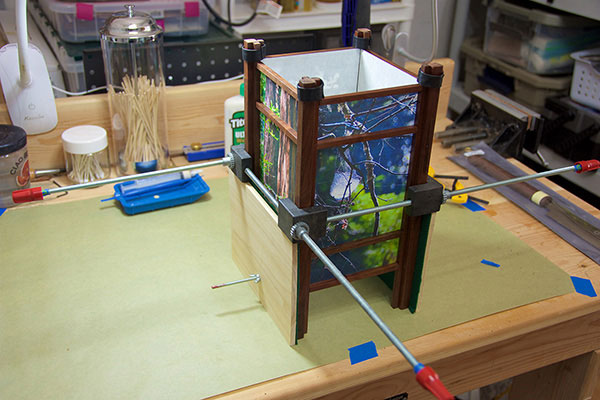 The base of each lamp is walnut or cherry, made up of 1/2" and 1/4" square "dowels."