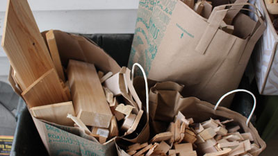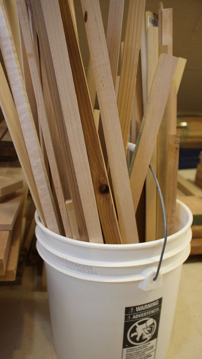 Once the pieces are sorted by species, it may be necessary or desirable (depending on how big each pile is) to do a further sort, this time by general size. In my shop, the sheer quantity of leftovers makes "size" sorting critical. You can do this a variety of ways, but this is the perfect time to have some ideas about how you intend to use the scraps.
