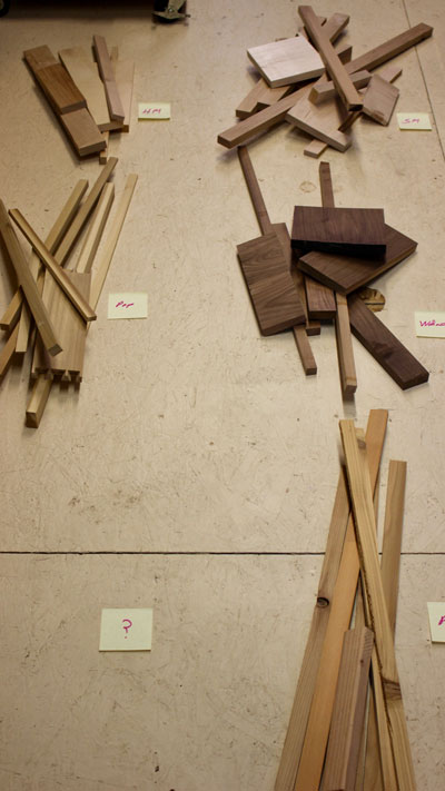 The first step toward organized and orderly consumption of scrap is to sort the pieces by species. Some pieces are pretty easy to identify… some take a bit more scrutiny. It's pretty easy to tell maple from walnut, and there is no chance of mixing up ash and zebrawood, but cherry can be a bit deceptive lurking in a pile mixed with poplar, pine, and ash. Sometimes canary wood can fool you, and oak isn't as easy to distinguish as you might think. So it is not uncommon to have one stack of "unknowns" that requires further examination. So clear a big space on the floor or on a work table and start making piles.