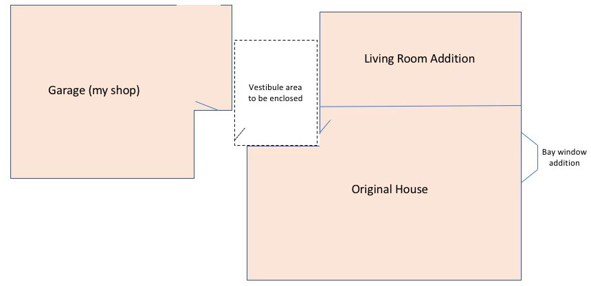 . The space between the shop and the house was deemed "the breezeway" which was more than apt, because the area was literally a wind tunnel. In the Winter, snow would blow in and drift to unimaginable heights. In the Fall the leaves would fill the area, and in our only other Wisconsin season, called "Rain," the area was a muddy mess. Since purchasing the house, my dream had been to enclose the area and form a "vestibule" between the shop and the house.
