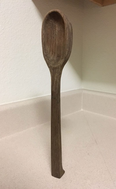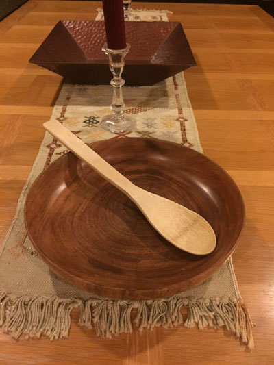 Below are a ladle that Jeremy carved for his brother and sister-in-law and a bamboo spoon sitting in a mesquite bowl I (Jim) turned.