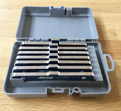 These precision bars are available from 1/8" (0.125") to 1/2" (0.5") in 1/16th increments. They are very useful around the shop because each bar has three different measurement locations; A concave cutout at the bottom to set the height of a tool blade, an extension at the top to determine the depth of a cut and a protrusion on the end to setup the distance between a saw blade and a fence, as an example.